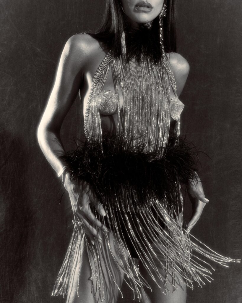 As peças, que fazem parte da coleção ‘Manifesto da Luz’, brincam com o contraste entre delicadeza e força. O primeiro se destaca pela malha de metal de aparência líquida adornada por cristais, com um aspecto fluído e resistente ao mesmo tempo. Para o segundo dia de desfiles, a artista trouxe uma combinação de plumas e cristais, acrescentando um toque glam para a composição. O conjunto, feito inteiramente de franjas de cristais, deixou o brilho como grande protagonista.