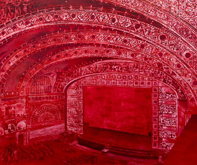 “A suspensão da descrença” parte de uma noção do cinema: suspender referências prévias diante da imagem. Nesta exposição, trabalhei a galeria como metáfora da mente, com elementos recorrentes como teatro, cinema, memória, reflexo e cor. O conjunto também apresenta uma pesquisa técnica recente, com tinta a óleo aplicada sobre serigrafia em tela e desenhos em anil sobre papel.” Bruno Vilela