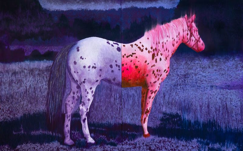 As obras foram desenvolvidas a partir de um projeto em que a galeria é tratada como metáfora da mente. Nesse conjunto, aparecem teatros, cinemas, cortinas, arquibancadas, reflexos, animais e passagens. A figura de Janus, divindade romana ligada aos começos, às passagens e à duplicidade, reaparece como uma chave recorrente e ajuda a situar um dos eixos da mostra: a imagem como campo de reflexos, intervalos e desdobramentos. Há também um dado técnico novo nesta produção. Bruno Vilela incorpora tinta a óleo a aplicações de serigrafia sobre tela, aproximando luz, meio-tom, mancha e retícula. A mostra inclui ainda desenhos realizados com washi e pó azul ultramar, também conhecido como anil, sobre papel de algodão. Essa série de nove trabalhos parte da narrativa do cervo-almiscareiro, animal que procura na floresta o perfume que carrega no próprio corpo. Reflexos, espelhos, rios, dobras e descontinuidades surgem de modo recorrente nesse núcleo, assim como campos monocromáticos de vermelho, azul e amarelo, que estruturam visualmente várias das obras. Cavalos, arquiteturas cênicas, corpos e vestígios aparecem como elementos centrais na construção imagética do artista.