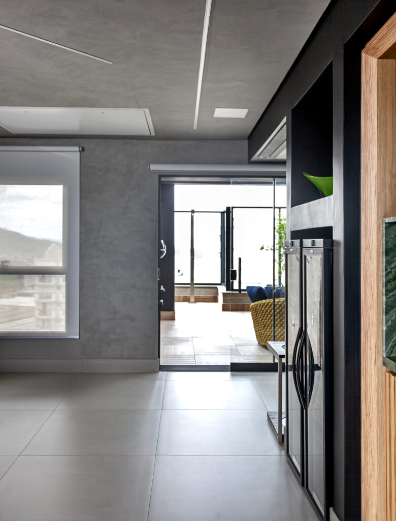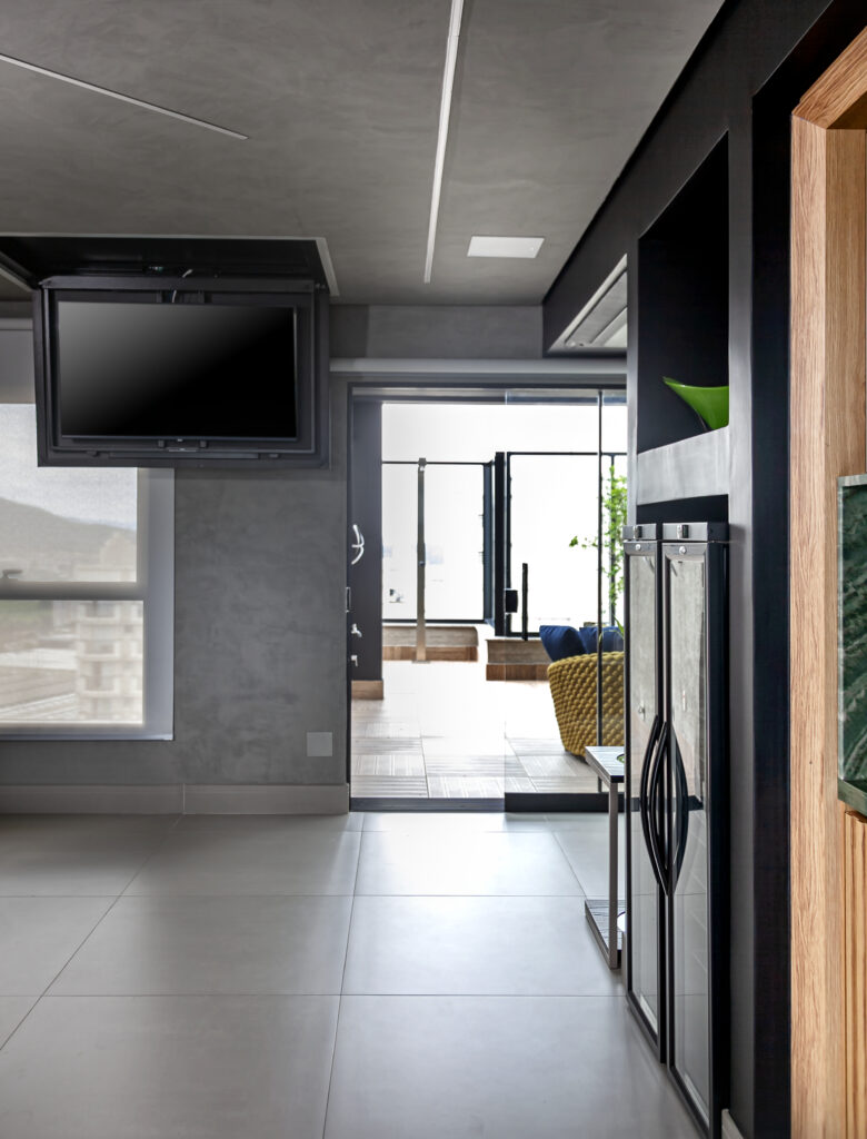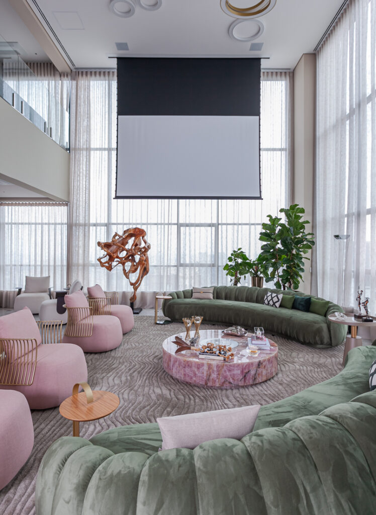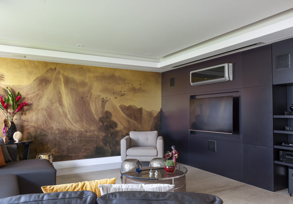 “A escolha de um projetor com alta capacidade de brilho é essencial, mas sem um sistema de blackout adequado, a interferência luminosa compromete a qualidade da imagem, reduzindo a nitidez e o contraste da projeção”, completa Cristiane que, buscando inovar ainda mais nesse projeto, optou pelo telão retrátil embutido no teto, em que desce e sobe a partir de um rolo acionado remotamente.