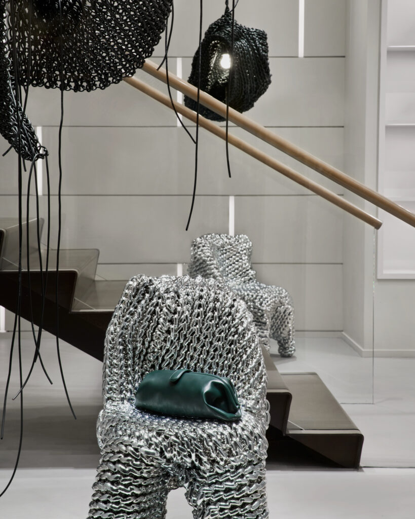Intitulada Lightful, a instalação combina uma forma suspensa e entrelaçada — característica do trabalho de Lee — com novas esculturas luminosas feitas a partir de fettucce de couro (tiras) da Bottega Veneta. Em tons exclusivos de preto e verde, escolhidos pela diretora criativa Louise Trotter, cada peça apresenta formas orgânicas e únicas que traduzem o potencial artesanal do artista.