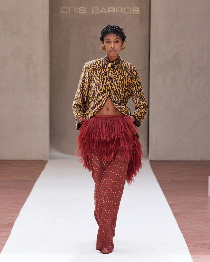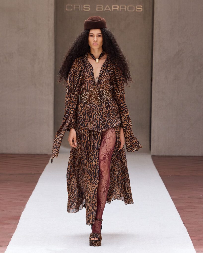 O caráter maximalista da coleção se expressa no mix intenso de estampas, texturas e padronagens. O poá surge como um dos grandes protagonistas, explorado em diferentes cores, escalas e materiais, tanto na delicadeza da organza, quanto na riqueza do veludo, enquanto a estampa de onça aparece como elemento de força gráfica. Padronagens dialogam entre si em composições equilibradas, potencializadas por um styling marcante que aposta em sobreposições e acessórios como parte essencial da construção visual. As boinas surgem como um dos principais destaques da coleção, arrematando os looks com personalidade.