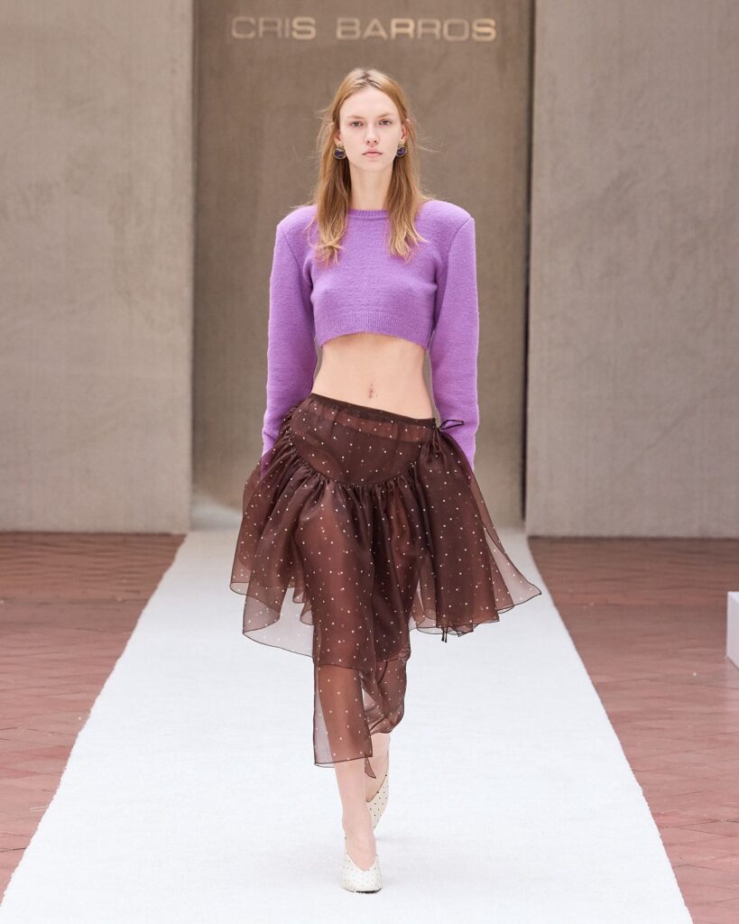 As silhuetas da coleção AW26 se aproximam do corpo e exploram essa proximidade por meio de transparências, recortes precisos e volumes controlados. Vestidos, saias e conjuntos revelam e escondem a pele em um jogo sutil, muitas vezes construído a partir de sobreposições com segundas peles, criando profundidade visual e movimento.