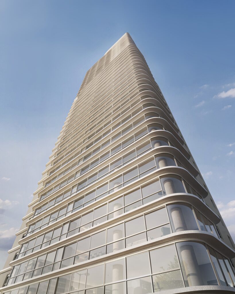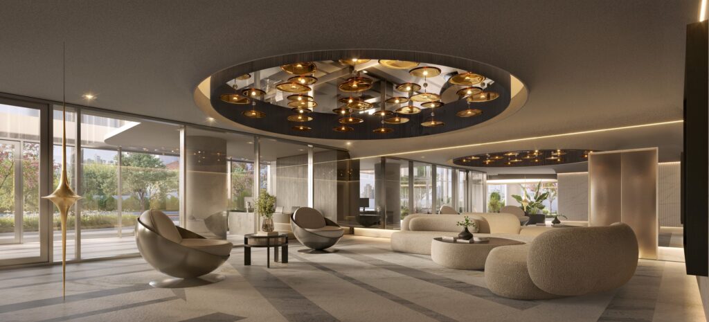 Com um projeto inspirado em edifícios ícones do luxo em Nova Iorque, Dubai e Miame, a torre é em si um dos grandes destaques do empreendimento. Em tons de brancos e prata, a fachada envidraçada revela uma arquitetura escultórica, onde o design autoral se expressa em cada linha. As esquadrias de piso ao teto envolvem o living, atenuando os limites entre interior e paisagem. Por dentro, sua transparência abre o apartamento para a paisagem, com esquadrias piso/teto, enquanto por fora, o vidro cristalino reflete o entorno, conferindo ao volume uma silhueta brilhante que se funde com o céu”, explica o arquiteto Frederico Bretones.