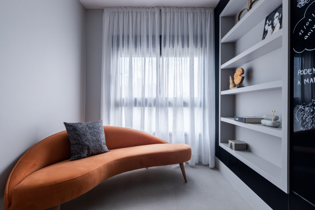 ‘Parente’ do terracota, só de bater o olho o sofá laranja entrega seu vigor. E não é para menos: a cor traz jovialidade e o entusiasmo que estimula as pessoas – principalmente quando está presente na decoração de interiores. Para usá-la com êxito, a profissional indica a combinação com bases neutras que propiciem harmonia visual.